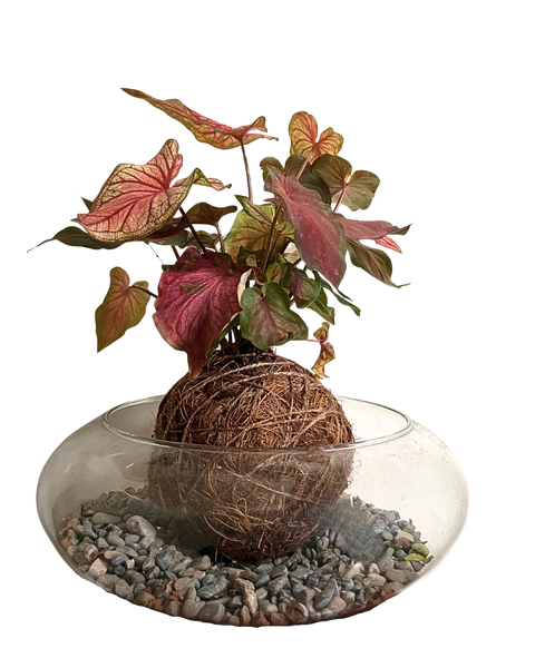 Kokedama Caladium en Base de vidrio.