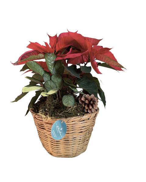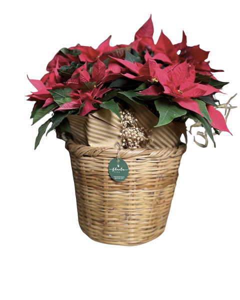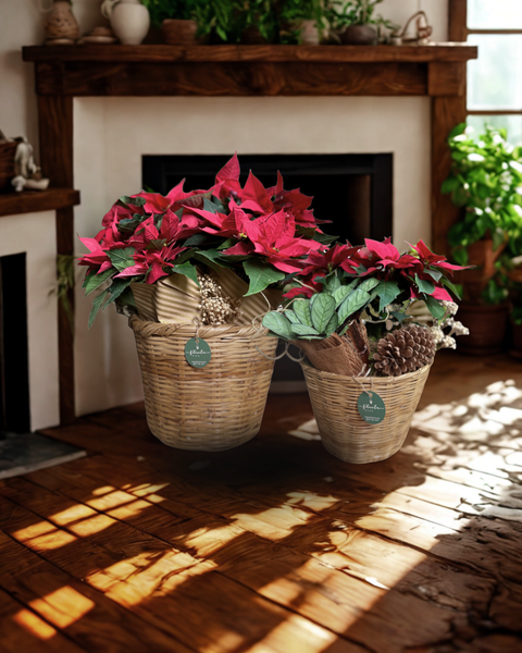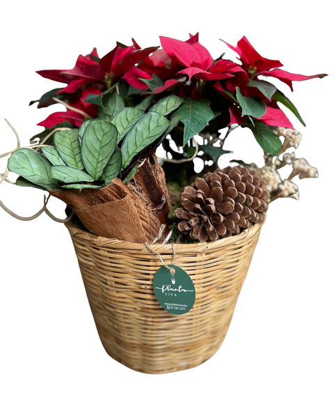 Una cesta llena de nochebuenas, plantas verdes y detalles de invierno, ideal para transformar cualquier espacio con un toque cálido y festivo.